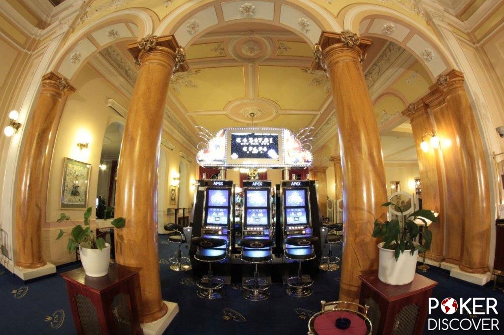 The design and interior is a mix of old and new. Four large marble columns dominated the gaming hall. Cream-colored walls, plaster ceilings covered with gold leaf and a carpet in royal blue are a great contrast.